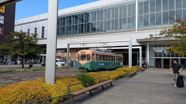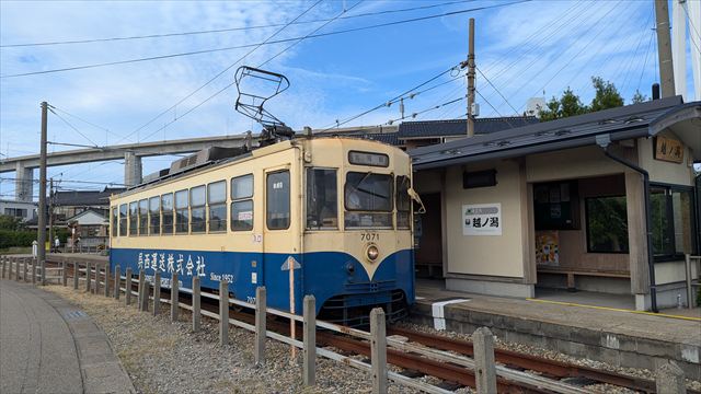 14:50 下船すると万葉線が越ノ潟に到着するところだった