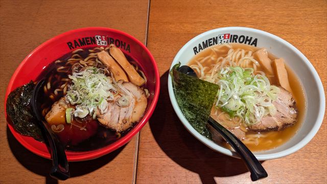 12:51 麺家いろはで僕は富山ブラックらーめん、真理子は白エビだし塩らーめん(各970円)