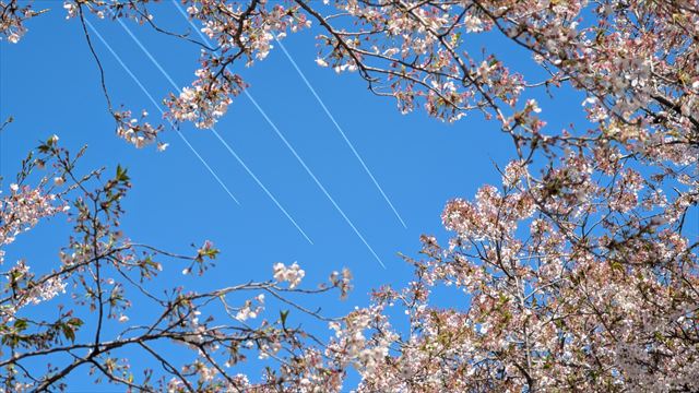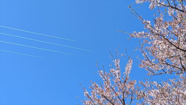 舟川べりで桜の写真を撮っていると真理子がブルーインパルスを発見。