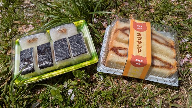 12:52 道の駅KOKOくろべで買ってきたカツサンドと寿司